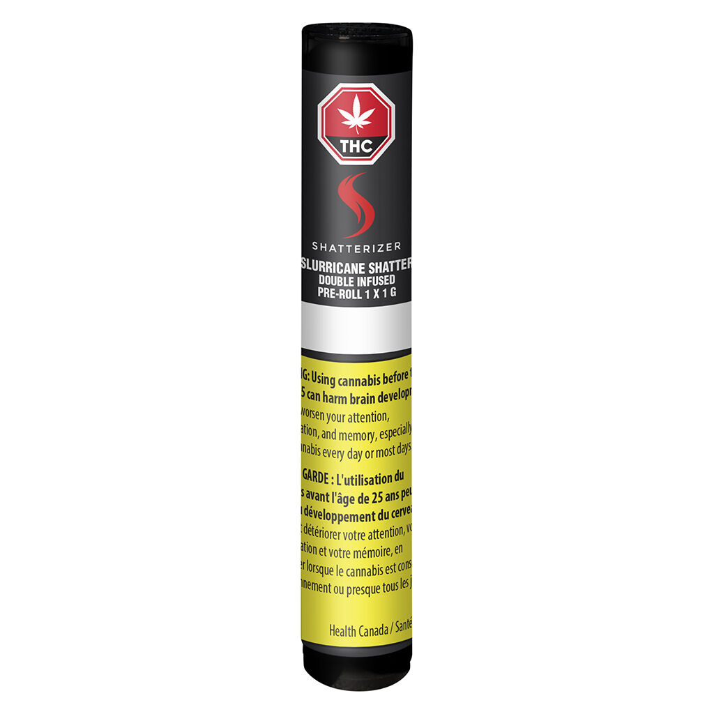 SHATTERIZER SLURRICANE Double Infused Pre-Roll is a heavy-hitting infused pre-roll built for experienced consumers who want maximum punch in a ready-to-go format. It starts with perfectly cured, ground cannabis flower and gets evenly infused with Slurricane shatter made via a hydrocarbon extraction process. To take it even further, the joint is finished with a kief coating for that true “double infused” kick. With THC listed at 36–44%, this is firmly in the extreme potency tier.
