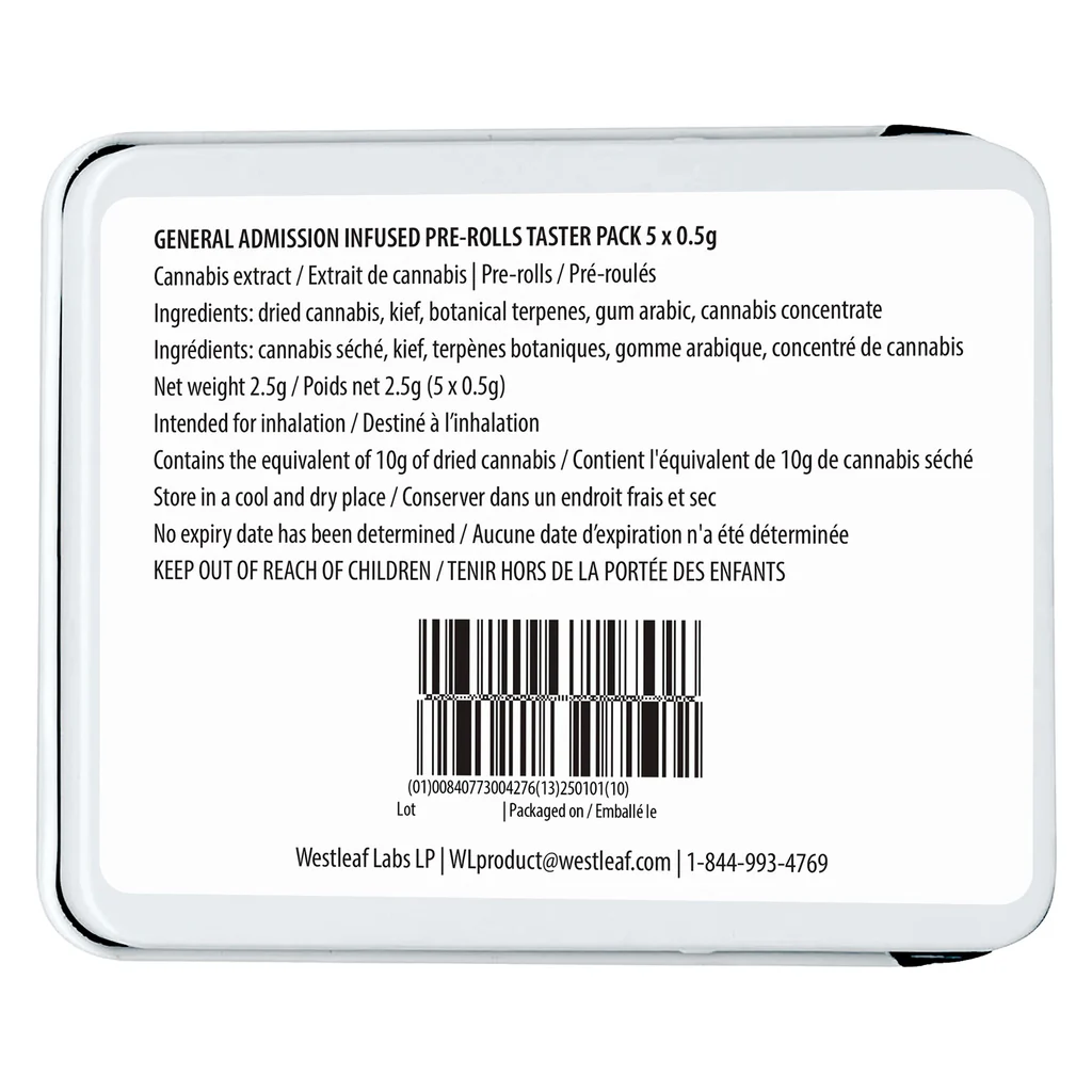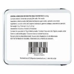 The G.A. Taster Pack brings together a rotating lineup of ultra-potent infused pre-rolls designed for big sessions and bold flavour lovers. Each pre-roll is crafted using milled whole flower, infused with General Admission’s signature triple-distilled distillate, dusted with premium kief, and boosted with botanical terpenes for a smooth, powerful smoke. With flavours that rotate regularly, this pack keeps things fresh while delivering the strong THC effects General Admission is known for. Find the General Admission Taster Pack at Potherb Cannabis Dispensary in Mississauga for a high-potency, variety-packed pre-roll experience.